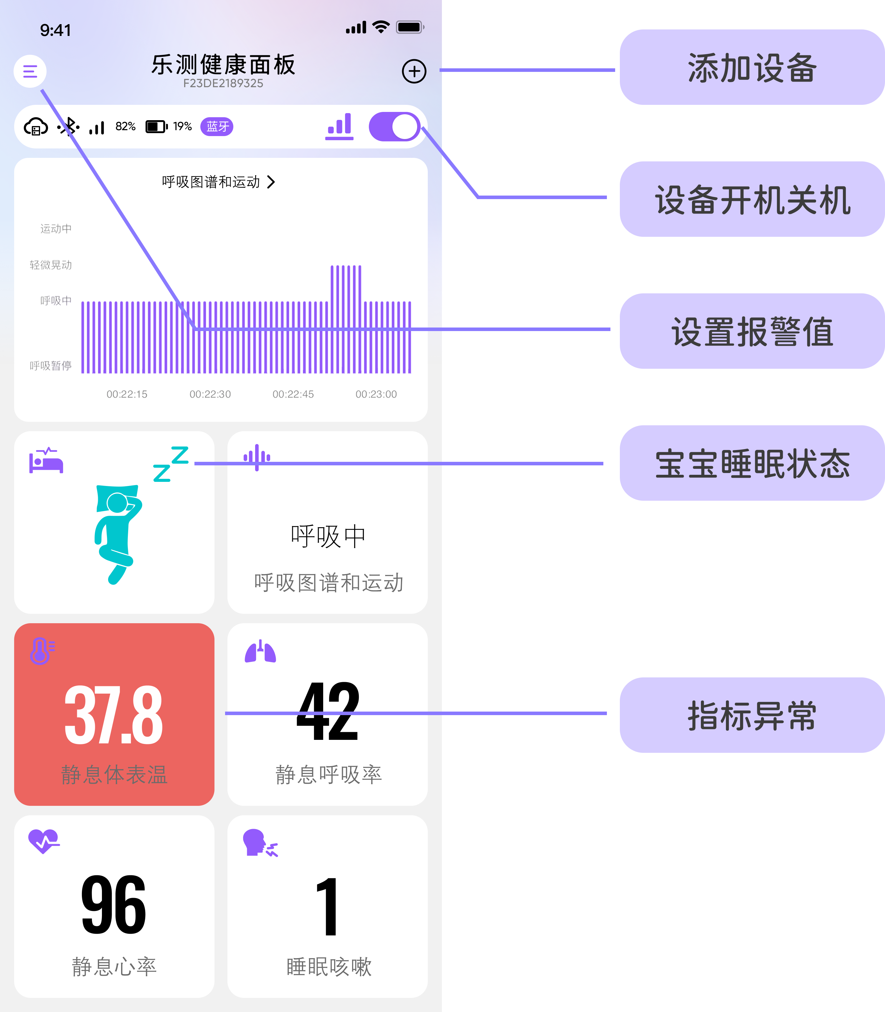 - 呼吸/心率功能监测时需保持卧姿,安静,不要晃动身体,不要退出程序一分钟更新一次结果;心率功能适用于18个月以上宝宝。